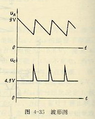 在圖4-34所示的電路中,當輸入電壓u3為0時,雙三極管BG15的右半部三極管在電阻R45、R46的偏置下導通,導通電流Ie2在R42上的壓降使B點電位為-0.6V,使左半部三極管剛好處于截止狀態。因為它截止,C19不充電,所以A點電位為+9V,BG17的射極通過R44與A點相接。由于R44很小,只有47Ω,所以BG17的射極電位也是+9V,而它的基極電位是+405V(由R48,R49的分壓比決定),基極電位低于發射極電位,因此BG17、BG16都處于截止狀態。當有直流正電壓輸入時,BG15左半部的三極管開始導通。它的集電極電流Ic1對C19充電,使A點電位逐漸下降。當電位降到3.8V時,BG17的射極電位比基極電位低0.7V,這時BG17就開始導通,它的集電極電流提供給BG16作為基極電流,使BG16也導通,它的發射極電流流過R49,在R49上產生電壓降,使C點電位上升,促使BG17進一步導通。這是一個很強的正反饋過程,在很短的時間內就使BG17、BG16處于飽和導通狀態,BG16的集射極間呈短路狀態,C點電位就由+4.5V跳變到+9V。與此同時,C19上的電荷通過R44、BG17、BG16放電。在放電過程中,A點電位隨之上升。當它升至大于8.3V后,BG17的基射極間的電壓就小于0.7V,使BG17退出飽和導通狀態,轉向截止。這一過程是上面的逆過程,強烈的正反饋使BG17、BG16迅速截止,C點電位恢復到原來的4.5V,C19又重新開始充電。重復上述過程就形成一連串的脈沖輸出。其波形如圖4-35所示。